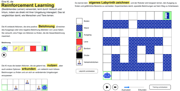 ![]() Gradientenverfahren: Zwei Schiffe schicken Sonden auf den Meeresboden um einen Schatz zu finden, der sich am tiefsten Punkt des Meeresbodens befindet. Wie findet man ihn am schnellsten? ![]() Programm "Reinforcement Learning": Ein Roboter muss den Weg durch ein Labyrinth finden. |